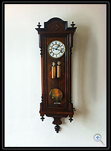 De reparatie bestond uit het reinigen van het uurwerk en het opnieuw smeren van alle draaiende onderdelen. De snaren zijn vernieuwd omdat ze rafelden. Het materiaal van deze snaren is kattendarm. Dit kan lang mee maar als hij begint te splijten is het zaak hem te vervangen. Het breken zou de kast erg kunnen beschadigen omdat beide gewichten nogal zwaar zijn.